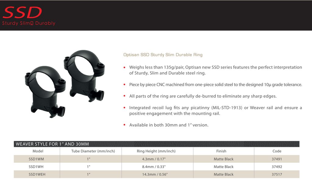 Kvalitní dvoudílná ocelová montáž Optisan SSD extra vysoká na lištu weaver nebo picatinny (MIL-STD-1913) pro puškohledy o průměru tubusu 1" (25,4mm). Masivní a pevná konstrukce, montáž tak lze používat na všech zbraních bez omezení. Vyrobeno z jednoho kusu oceli, povrch je matně černý, montáž má jištění proti posunu na montážní liště. Každý pár montážních kroužků je slícován a prochází výstupní kontrolou. Výška od lišty k hraně prstence je 14,3mm délka montáže 14,2mm. Hmotnost montáží je 134g (2 kusy). Balení obsahuje dva kusy.