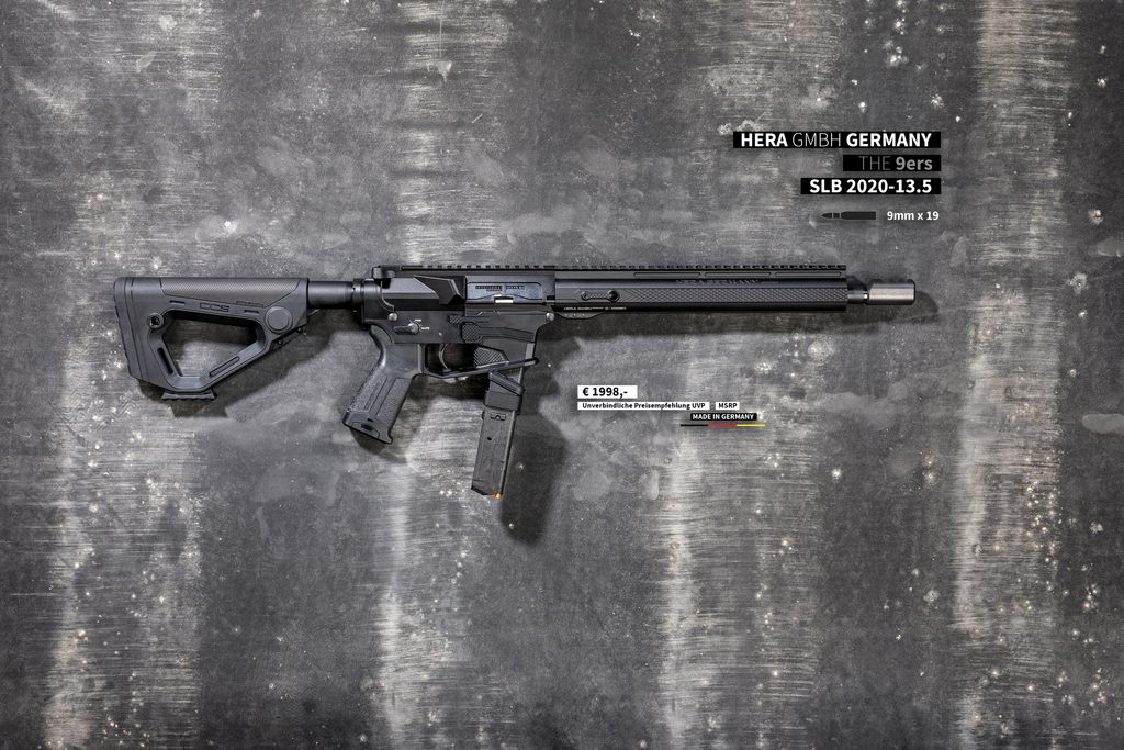 Kvalitní poloautomatická pistolová karabina německé firmy Hera Arms 9ers - s délkou hlavně 13,5". Ráže 9 mm Luger. Stoupání hlavně je 1/10. Zbraň je osazena montážní lištou weaver 22 mm pro umístění optického zařízení a jiného příslušenství nad hlaveň. Předpažbí je vybaveno montážním systémem typu key-mode. Hlaveň je osazena úsťovou brzdou PCC (sport) z produkce firmy Hera Arms. Pistolová rukojeť má krytý prostor v rukojeti pro příslušenství (baterie,...). Nastavitelná pažba. Zásobníky Glock 9 mm Luger (zbraň je také možné objednat s konverzí pro zásobníky Colt).