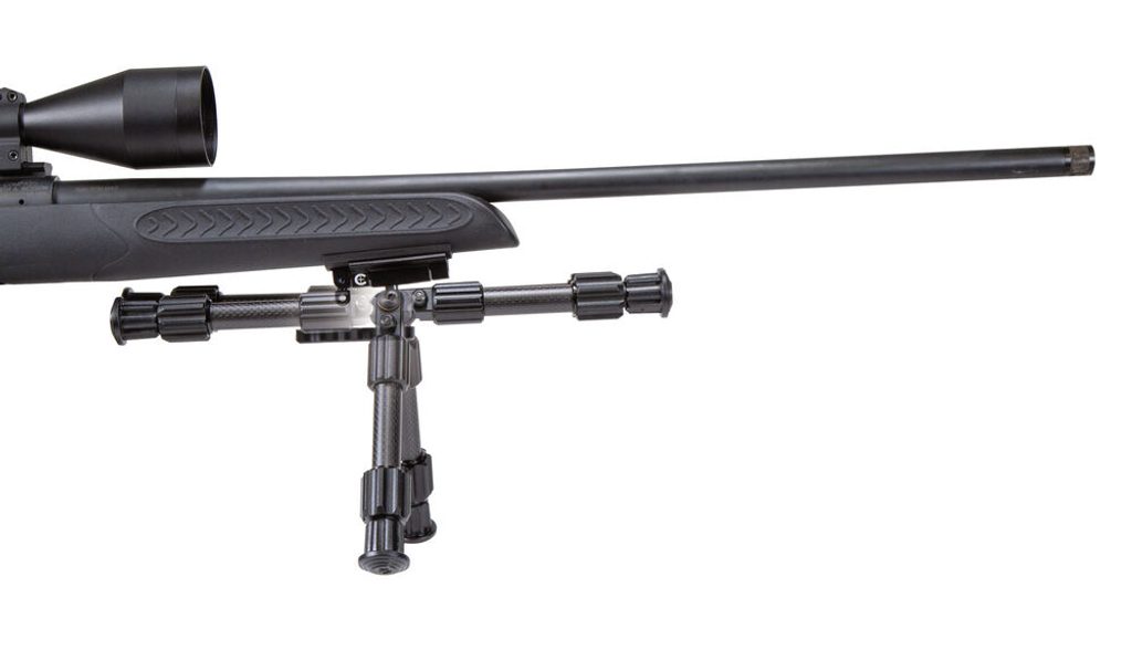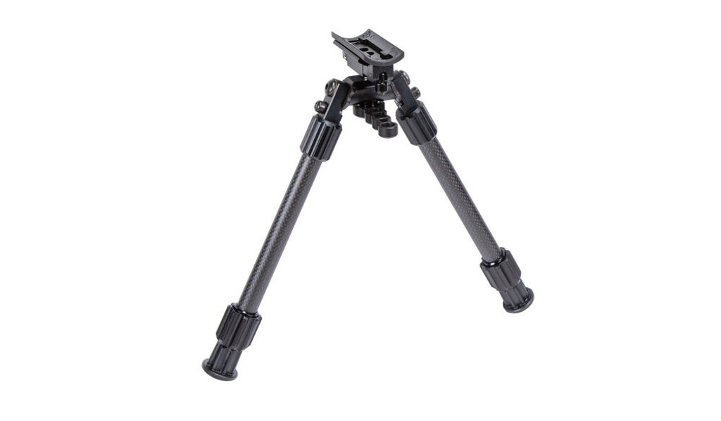 Karbonový bipod (dvojnožka) Caldwell Accumax Premium 9 - 13" s kloubem. Bipod se montuje na poutko pro řemen. Bipod je vyrobený z uhlíkových vláken (karbon) a díky tomu je mimořádně lehký. Hmotnost je pouze 265 g. Kloub bipodu umožňuje naklánění do stran a tím jemné vyrovnání nerovností povrchu, což je velmi důležité, protože u dvojnožky které mají nožky vysouvací skokem je v případě nerovností nutné korigovat náklon zbraně, aby výšková korekce propadu střely byla opravdu svislá. Bipod je sklopný, takže při transportu zbraně zabírá minimum místa a je nastavitelný v rozsahu od 9 - 13" (23 – 33 cm).