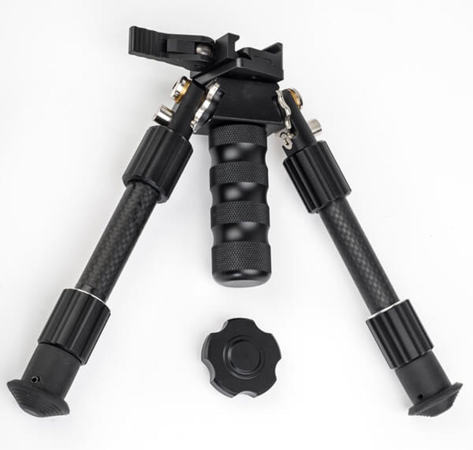 The AimGrip Bipod has legs made of carbon fibre. And each leg has a rubber foot at the base for solid support on any ground. Alloy fittings also allow for angular and height adjustments. The monopod style hand grip is made of steel and is blacked. This features a knurled and scalloped grip. The overall weight is 434g (15oz), so it will not upset the balance of your rifle.