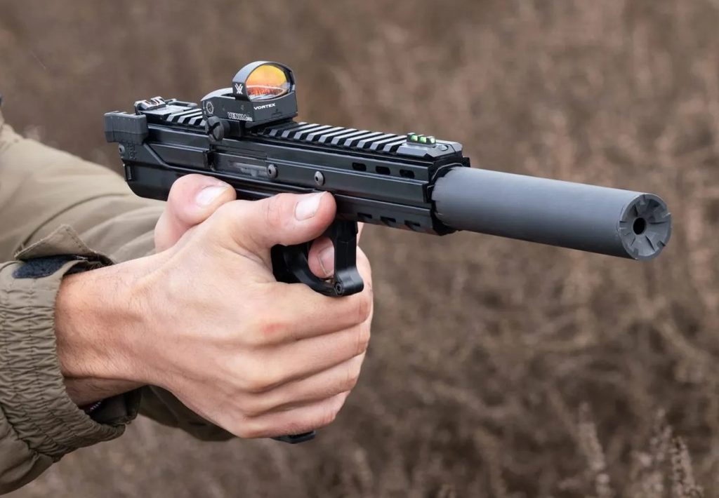 Nastavitelná mířidla z optických vláken, vzdálenost mezi mířidly je 23cm a hlaveň se závitem jsou standardem.