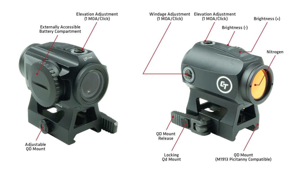 Elektronický zaměřovač CTS-1000 je kompaktní taktický zaměřovač Red Dot pro pušky a karabiny. Díky kulatému zaměřovacímu bodu 2,0 MOA CTS-1000 okamžitě zvýší přesnost Vaší dlouhé zbraně. CTS-1000 se instaluje během několika sekund s využitím rychloupínání (QD) na lištu a bez námahy se tak připevní k lištám M1913 Picatinny.