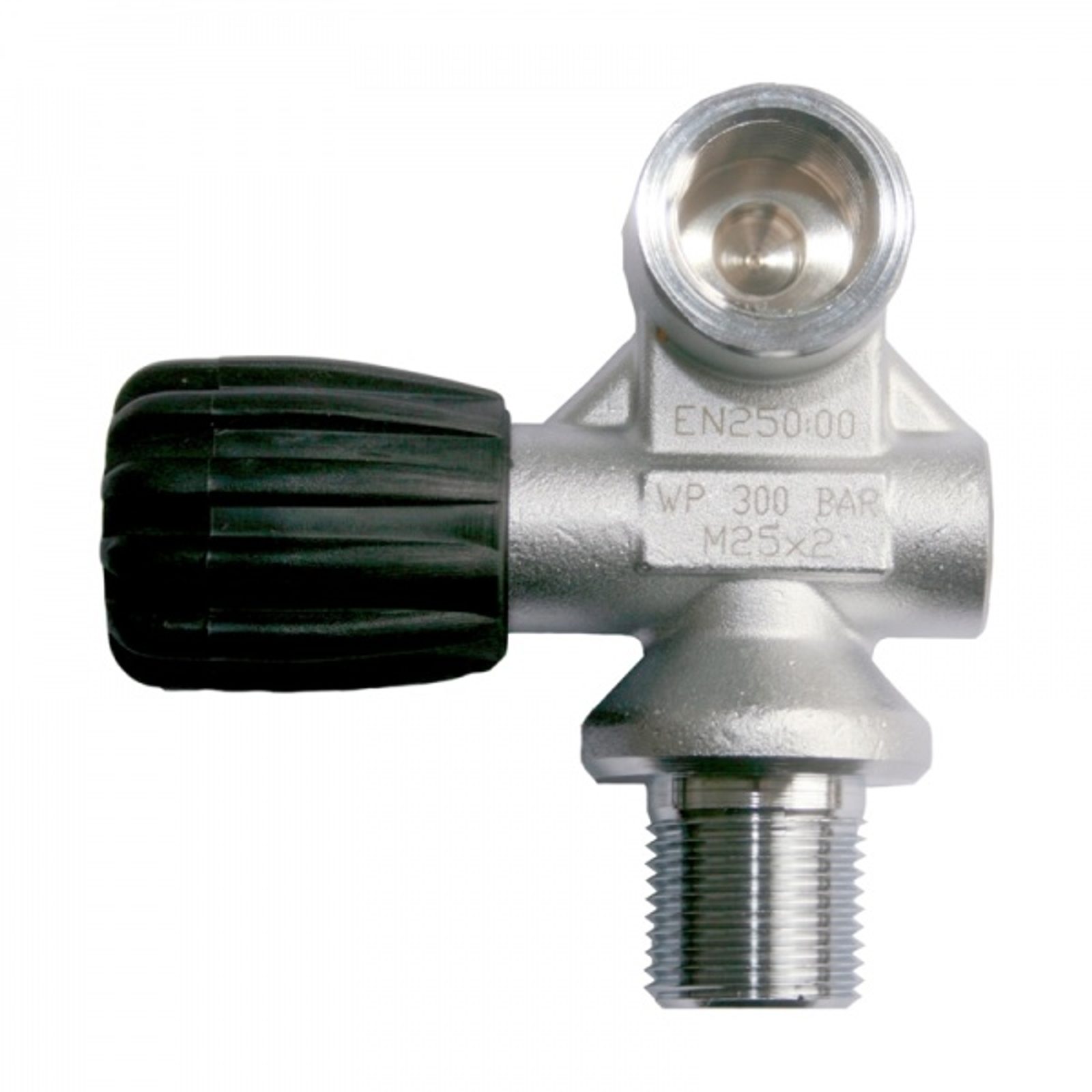Monoventil do tlakové láhve, provozní tlak 300 bar, závit do láhve M25x2, závit ventilu DIN G5/8". Gumové točítko.
