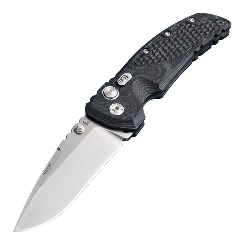 Nůž Hogue EX-01 Drop Point Blade 4" G10 G-Mascus Black, který navrhnul Allen Elishewitz. Čepel Drop Point s oboustranými palcovými čepy. Materiál čepele je z kryogenicky ošetřené nerezové oceli 154CM (tvrdost 57-59 HRC) s ručně broušeným ostřím. Zámek PushButton s manuální pojistkou pro uzamčení. Rukojeť je G-10 G-Mascus s texturou Mini Piranha. Pocket clip je vpravo, střenka obsahuje průvlak pro lanyard. Celková délka nože 225 mm, délka čepele 102 mm a délka rukojeti 123 mm. Vyrobeno v USA.