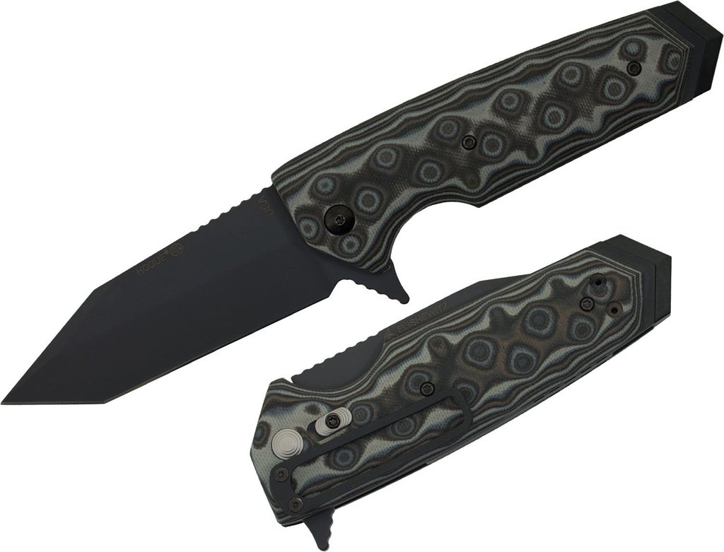 Zavírací nůž Hogue EX-02 3.75" Tanto Flipper G-10 G-Mascus Gray, který navrhnul Allen Elishewitz. Čepel z kryogenicky ošetřené nerezové oceli 154CM (tvrdost 57-59 HRC) s povrchovou úpravou černý cerakote. Zámek PushButton s manuální pojistkou. Rukojeť G-10 G-Mascus s texturou Mini Piranha. Pocket clip je vpravo, střenka obsahuje díru pro lanyard. Celková délka nože 222 mm, délka čepele 95 mm a délka rukojeti 127 mm. Vyrobeno v USA.
