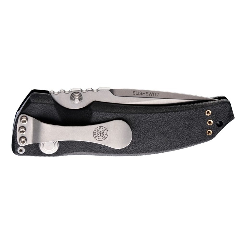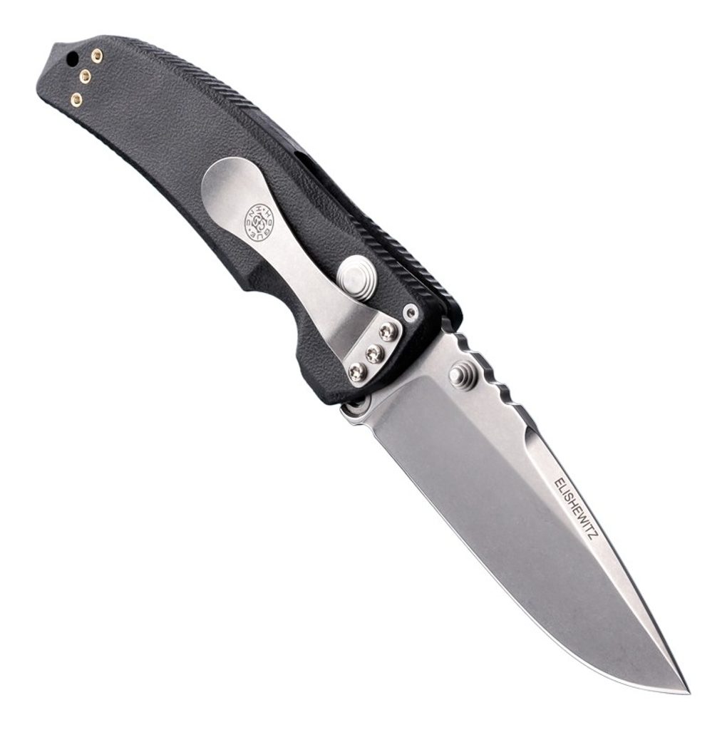 Nůž Hogue EX-03 3,5" Drop Point Blade Black Polymer, který navrhnul Allen Elishewitz. Čepel Drop Point s oboustranými palcovými čepy. Materiál čepele je z kryogenicky ošetřené nerezové oceli 154CM (tvrdost 57-59 HRC) s ručně broušeným ostřím. Zámek PushButton s manuální pojistkou pro uzamčení. Rukojeť je matný černý polymer s texturou. Pocket clip je vpravo, střenka obsahuje průvlak pro lanyard. Celková délka nože 206 mm, délka čepele 89 mm a délka rukojeti 117 mm. Vyrobeno v USA.
