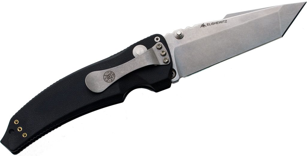 Nůž Hogue EX-03 3,5" Tanto Black Polymer, který navrhnul Allen Elishewitz. Čepel Tanto s oboustranými palcovými čepy. Materiál čepele je z kryogenicky ošetřené nerezové oceli 154CM (tvrdost 57-59 HRC) s ručně broušeným ostřím. Zámek PushButton s manuální pojistkou pro uzamčení. Rukojeť je černý matný polymer s texturou. Pocket clip je vpravo, střenka obsahuje průvlak pro lanyard. Celková délka nože 210 mm, délka čepele 89 mm a délka rukojeti 121 mm. Vyrobeno v USA.
