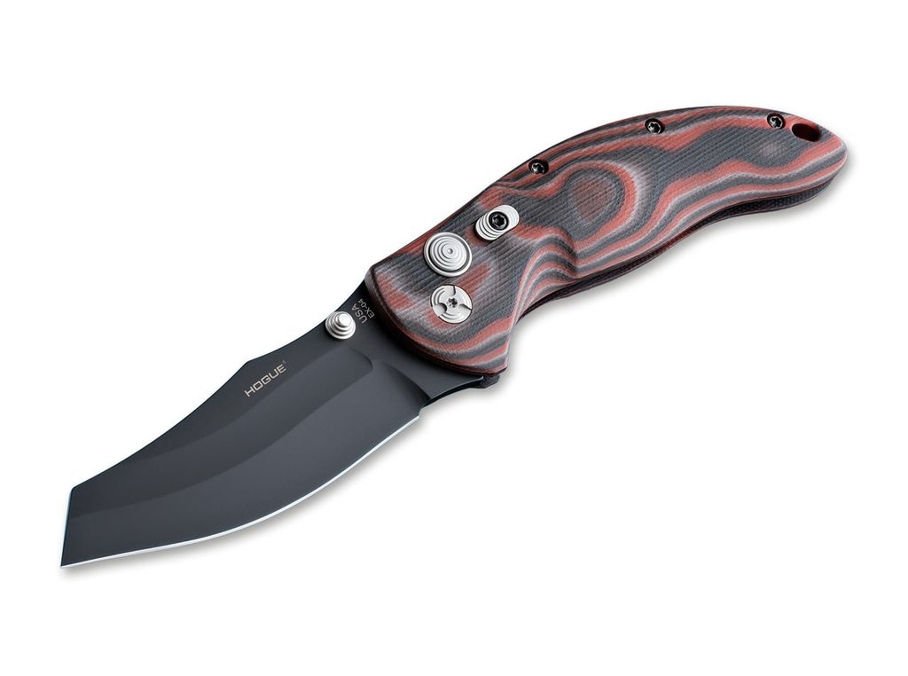 Zavírací nůž Hogue EX-04 4" Wharncliffe G-10 Red Lava, který navrhnul Allen Elishewitz. Čepel Wahrncliffe z kryogenicky ošetřené nerezové oceli 154CM (tvrdost 57-59 HRC) s povrchovou úpravou černý cerakote. Zámek PushButton s manuální pojistkou. Rukojeť G-10 G-Mascus s texturou Mini Piranha. Pocket clip je vpravo, střenka obsahuje díru pro lanyard. Celková délka nože 232 mm, délka čepele 102 mm a délka rukojeti 130 mm. Vyrobeno v USA.