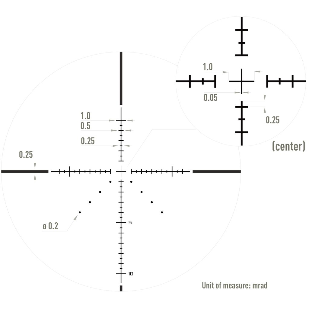 Záměrná osnova je jak je u Optisanu zvykem leptaná v čočce a je umístěná ve druhé ohniskové rovině. Všechny čočky puškohledu mají úpravu FMC (FullyMultiCoated, nad 7 vrstev + přísady). Puškohled je plněný argonem, který zabraňuje zamlžování čoček. Puškohledy jsou mrazuvzdorné, voděodolné a obsahují sluneční clonu, krytky okuláru a objektivu. Komínky puškohledu jsou lovecké (ultranízké) s klikáním 0,1 MRAD s možností uzamčení a nulování.