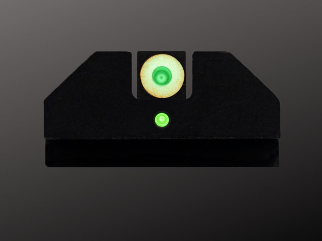 - Zadní hledí má bílý obrys s tritiovým středem