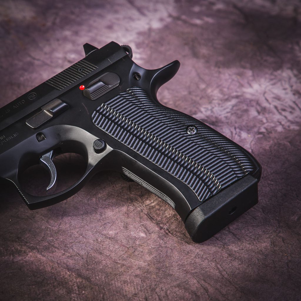 - Pevnost materiálu G10 umožňující nejtenčí možné rukojeti pro pistole s dvojitým zásobníkem.