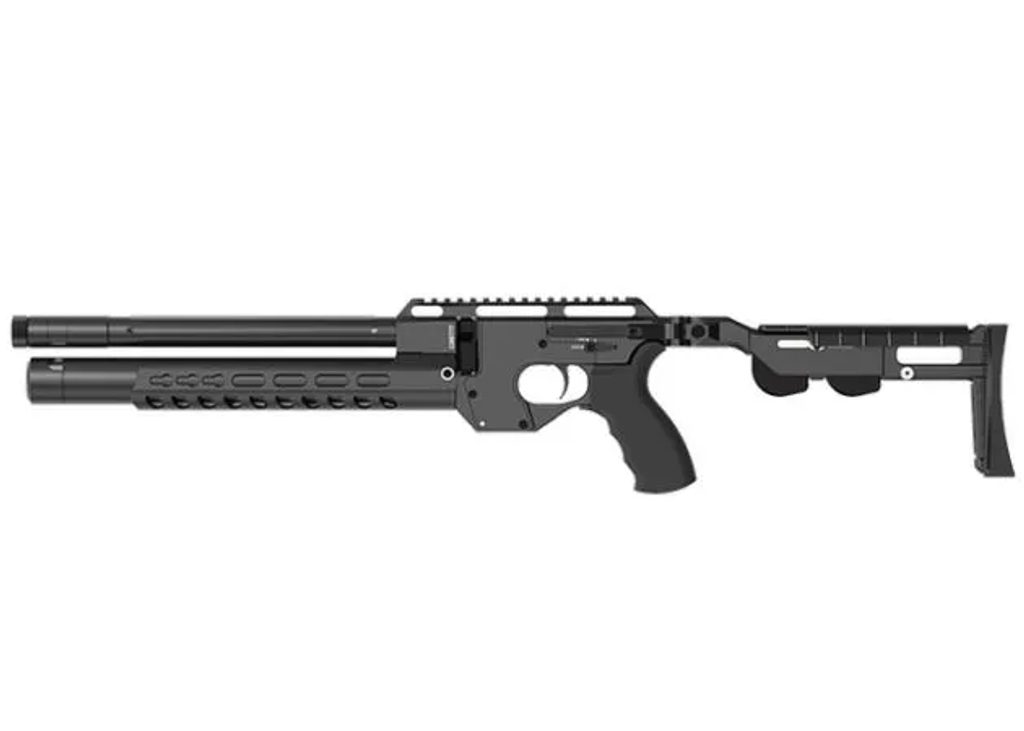 Vzduchovka AirMaks Arms Katran CB 5,5 mm je žhavá novinka pro rok 2021. AirMaks Arms Katran má odlehčenou celokovovou a sklopnou pažbu vyrobenou CNC obráběním. Botka pažby a lícnice jsou z ABS plastu. Pažba je sklopná na levou stranu a je jištěná proti nechtěnému otevření magnetem. Úchop je pistolový z příjemného měkčeného plastu a je shodný s puškami typu AR15.