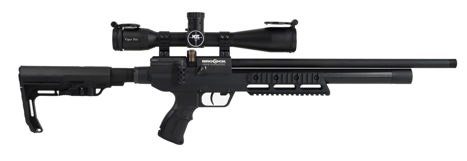 Spoušt vzduchovky nastavitelná a v přední části je umístěná pojistka. Přebíjení vzduchovky je pomocí boční páčky – Side Lever Action. Toto řešení nám přijde pohodlnější než u předchozí verze modelu Brocock Concept Lite, který měl přebíjení pomocí přímotažného závěru. Montážní lišta pro puškohled, případně kolimátor je weaver, montážní lišta pro doplňky je také weaver a umístěná v přední části pažby pod kartuší. Sklopná pažba i pistolová rukojeť jsou plně kompatibilní s doplňky pro AR15.