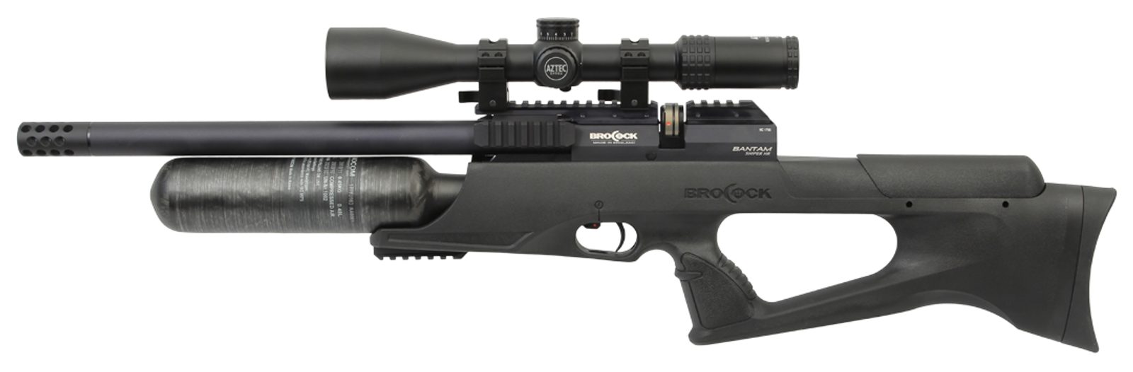 Spoušt vzduchovky nastavitelná a v přední části je umístěná pojistka. Přebíjení vzduchovky je pomocí boční páčky – Side Lever Action. Toto řešení nám přijde pohodlnější než u předchozí verze modelu BRK/Brocock Bantam, který měl přebíjení pomocí přímotažného závěru. Montážní lišta pro puškohled, případně kolimátor je 11mm, montážní lišta weaver je umístěná v přední části pažby pod kartuší. Vzduchovka je vybavená dvěma manometry. Jeden ukazuje tlak v kartuši a druhý tlak regulátoru. Nastavitelná lícnice z příjemného a nestudeného materiálu a nastavitelná botka se přizpůsobí každému střelci.